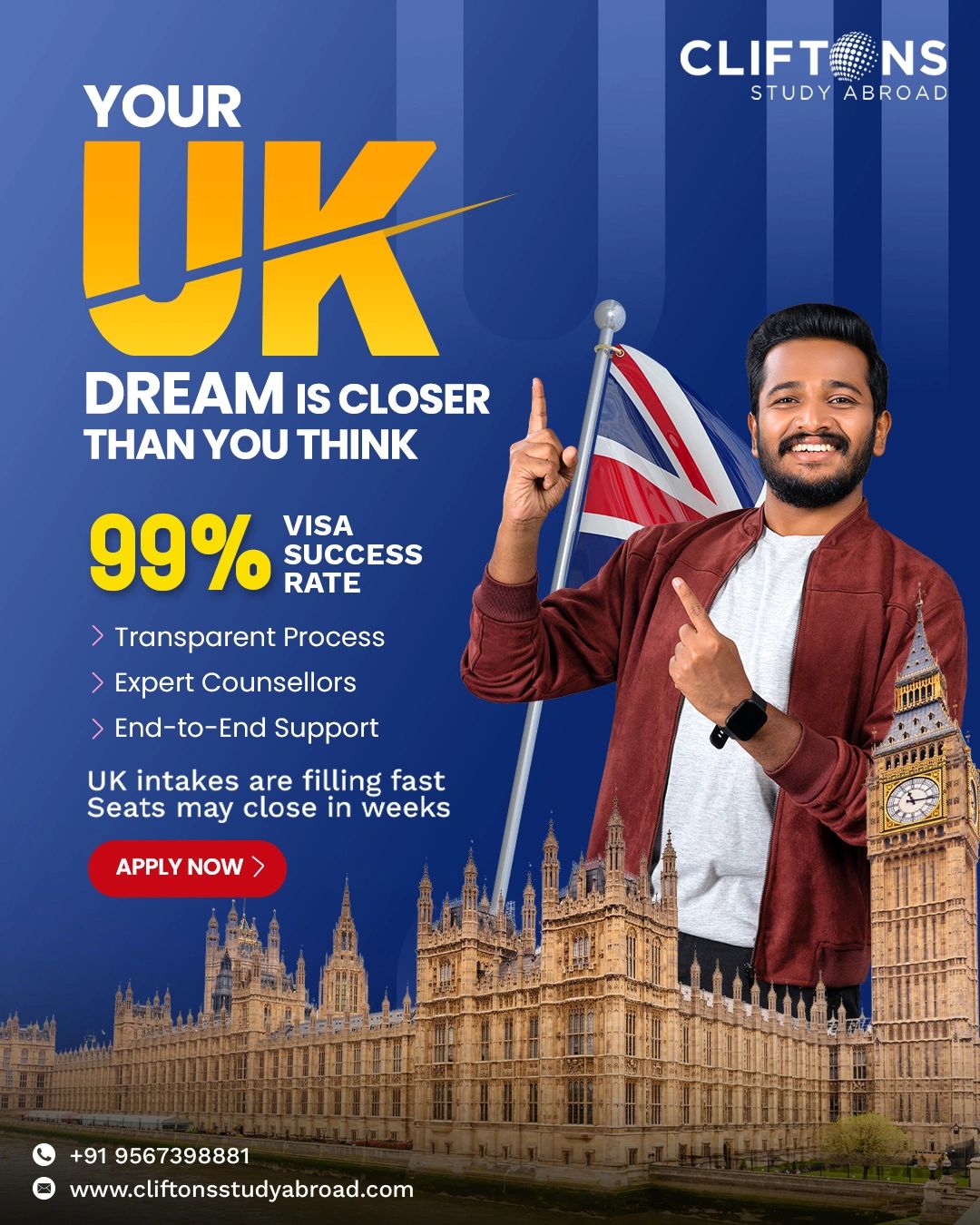 Cliftons Study Abroad is an overseas education consultancy based in Kochi, Kerala that helps students pursue higher education in top international universities. The consultancy provides end-to-end support including career counselling, university selection, application processing, visa assistance, scholarship guidance, and pre-departure support for countries such as the UK, Australia, Ireland, Germany, France, and New Zealand. With over 10 years of experience and partnerships with 500+ universities, Cliftons guides students through the entire study-abroad process to help them achieve their global education goals.