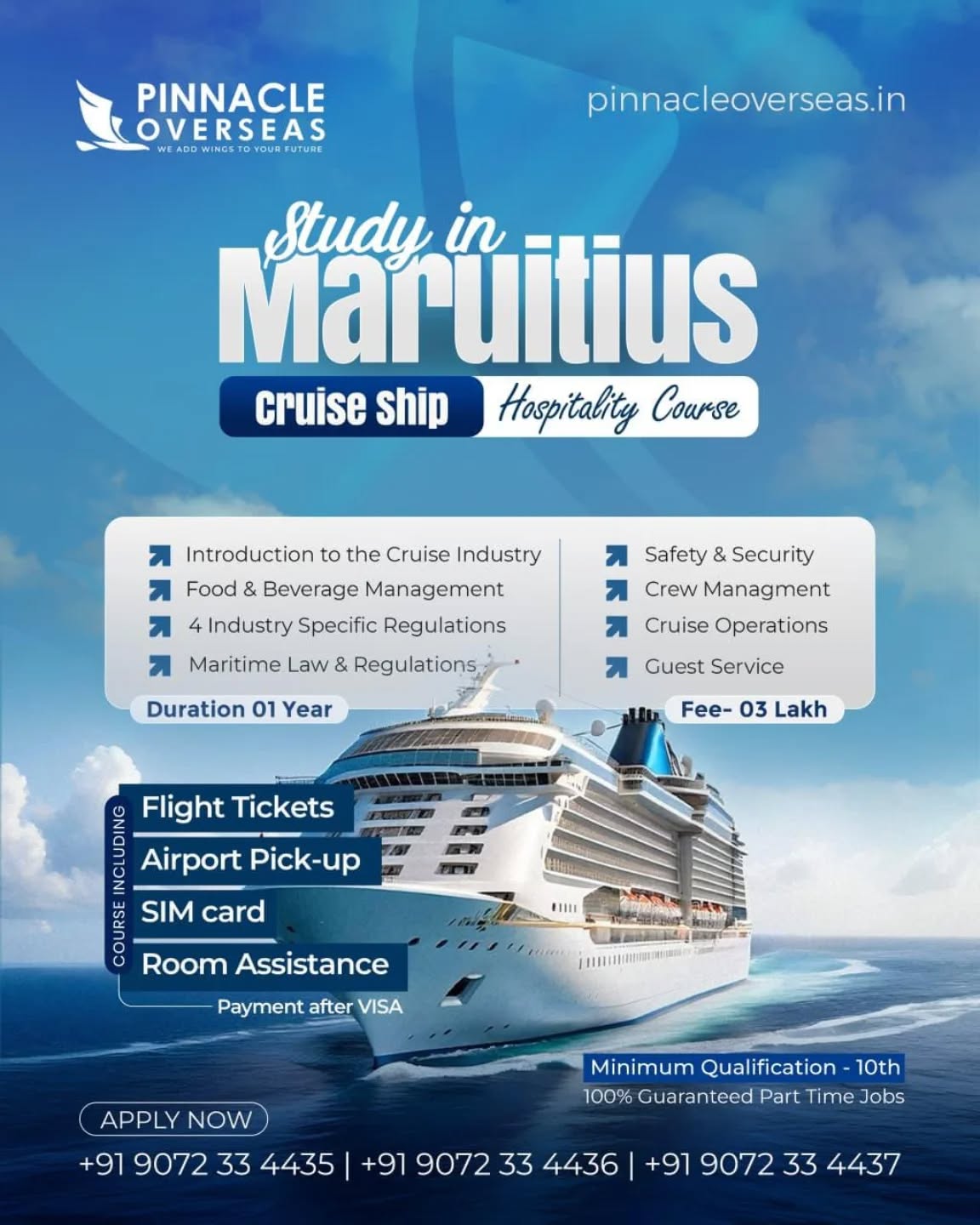 Pinnacle Overseas is an overseas education consultancy that helps students pursue higher education abroad. The company provides end-to-end guidance including career counselling, course and university selection, application support, visa processing, and post-landing assistance. With a focus on simplifying the study-abroad process, Pinnacle Overseas aims to help students secure admissions in top international universities and build successful global careers.