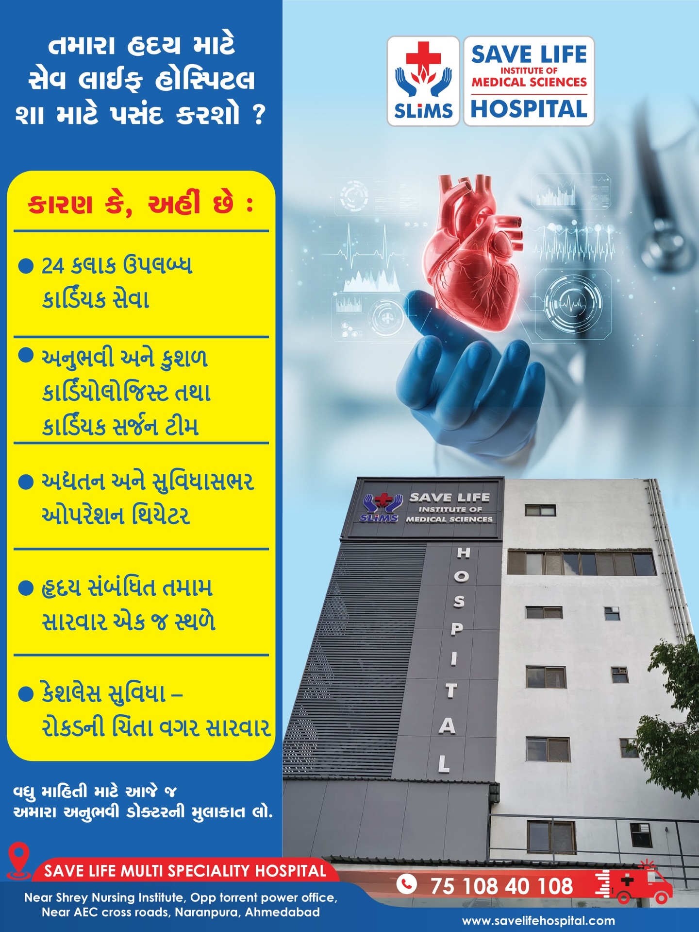 Save Life Multi Speciality Hospital is a prominent multi-speciality hospital in Ahmedabad offering a wide range of medical services for patients across various specialties. The hospital provides specialized care in cardiology, orthopaedics, neurology, gastroenterology, gynaecology, and general medicine. It is equipped with modern infrastructure including ICUs, operation theatres, diagnostic laboratories, and 24/7 emergency facilities to ensure high-quality patient care. With a team of experienced doctors, surgeons, and trained medical staff, Save Life Multi Speciality Hospital focuses on patient-centric and evidence-based treatments. By combining advanced medical technology with compassionate care, the hospital serves as a trusted healthcare destination for Ahmedabad and nearby regions.