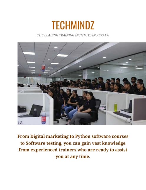 Techmindz is a professional IT training institute based in Kochi, Kerala, offering industry-focused courses in software development, DevOps, cybersecurity, digital marketing, UI/UX, and more. It provides both online and offline training, along with internships, corporate programs, and placement support to help students become job-ready.