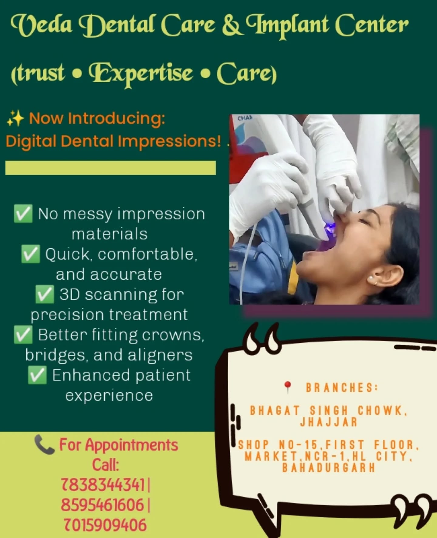 Veda Dental Care & Implant Center in Jhajjar, Haryana is a local dental clinic offering comprehensive oral healthcare services. The clinic provides a range of treatments including dental implants, root canal therapy (RCT), crowns & bridges, extractions, and routine dental check‑ups with a focus on quality care and patient comfort. Experienced dental professionals use modern techniques and maintain good hygiene standards to ensure effective and safe treatments. It’s considered a reliable choice for both everyday dental needs and more advanced procedures in the Jhajjar area.